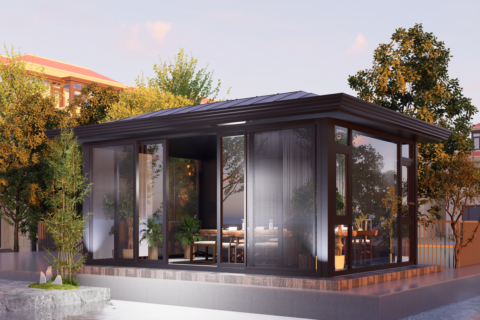 阳光房的设计结合了艺术夸张,用科学的诠释进行突破,彰显时尚风情。尖顶与灯…